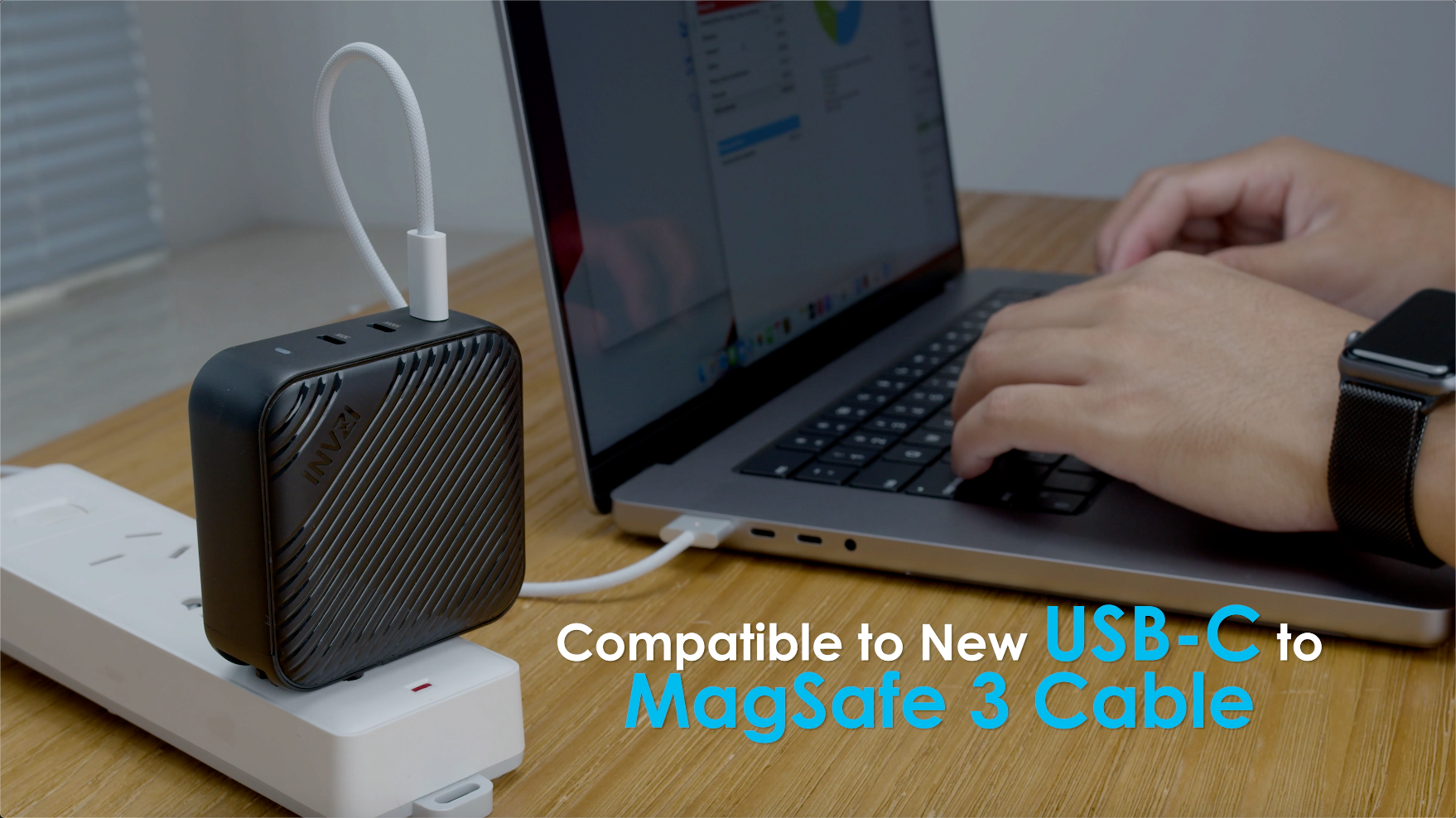 I purchased the INVZI GaNHub 140W USB C Charger, PD 3.1 For use with my MacBook Pro 16 M3. This power source is the 5th unit from INVZI that I own. They all have worked perfectly and provide an alternative travel option. INVZI provide a full range of POWER supplies and all provide the smallest compact lightweight, and more importantly, safe power supplies for your expensive devices. As you can see in the picture the140w Apple USB C Charger is much bigger, slightly thinner, but a lot heavier and only comes with one USB port. Travel adapters that clip straight on to the unit without removing any portion of the charger are available. They also sell an extension cord, which clips on to the unit without removal of the power supply pins.